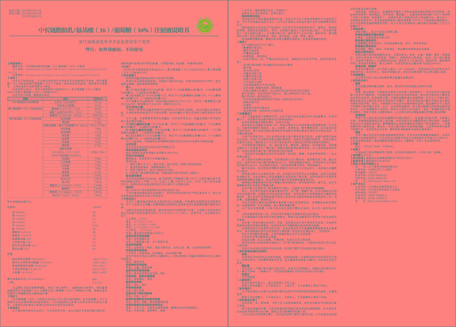 【通用名】中長鏈脂肪乳氨基酸(16)葡萄糖(16%)注射液