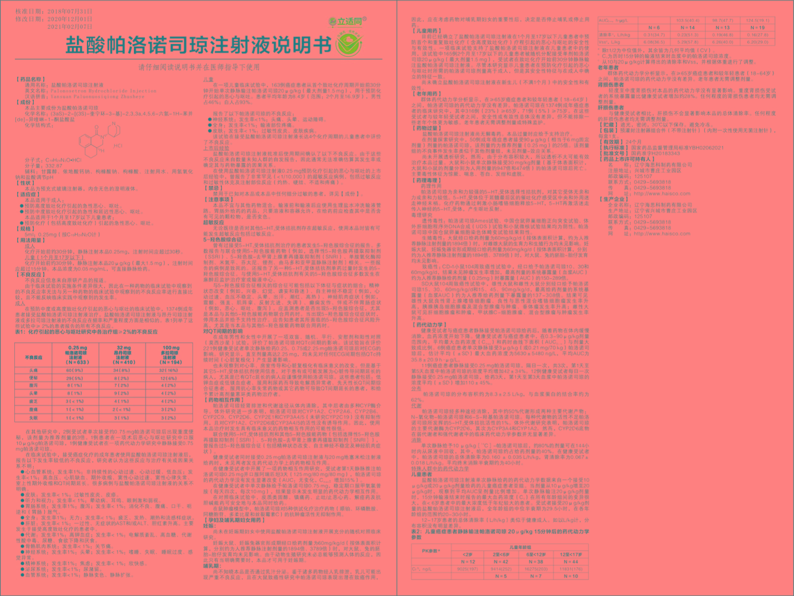 【通用名】鹽酸帕洛諾司瓊注射液